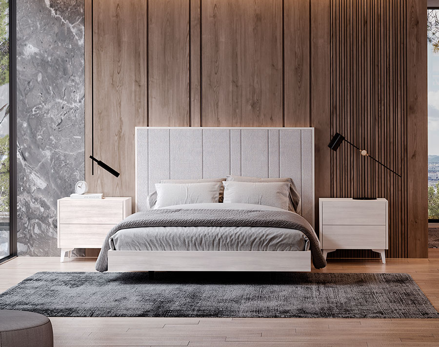 CAMA CASAL ESTOFADA TECIDO SHANGHAI CEMENT COM ESTRADO ELEVATÓRIO LOSANGULOS