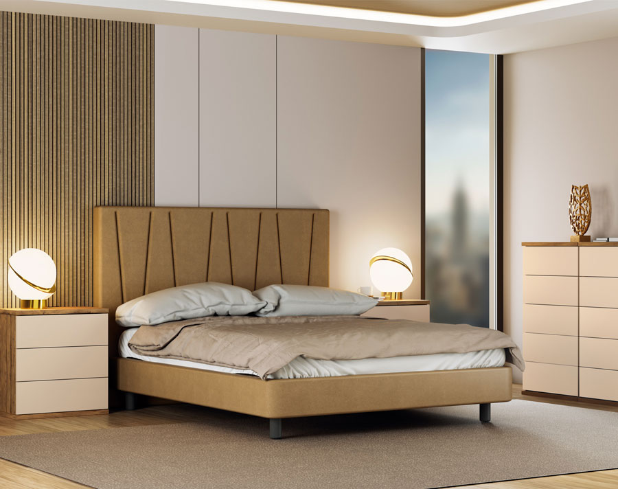 CAMA CASAL ESTOFADA TECIDO SHANGHAI SAND COM ESTRADO ELEVATÓRIO ARMANI COM 7 BOTÕES
